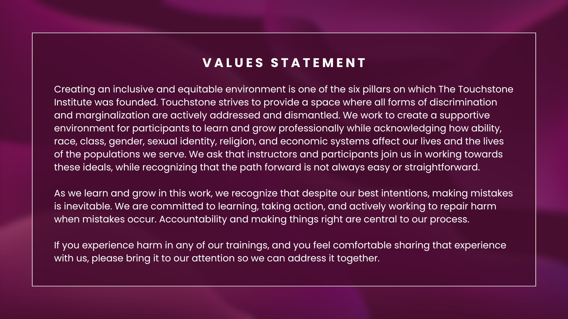 At the heart of our ethos is our anti-oppression statement, a significant pillar that The Touchstone Institute was founded upon. This statement guides our every interaction, informs our training program and is at the core of our commitment to combating all forms of oppression.